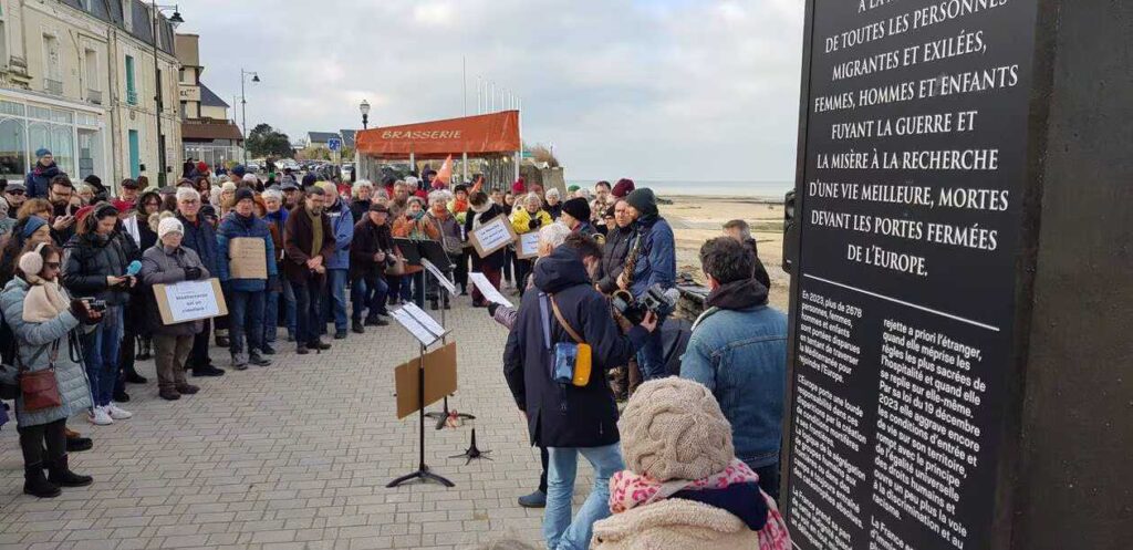 Nous étions plus de 300 rassemblés le 9 février à 15h à Saint-Aubin-sur-mer, en hommage aux personnes mortes ou disparues afin de se souvenir, dénoncer la violence des politiques migratoires et résister à la déshumanisation des personnes qui prennent la route et tentent d’exercer leur liberté de circuler au péril de leur vie.